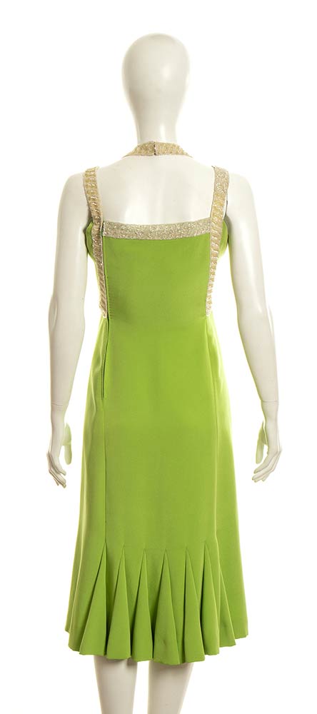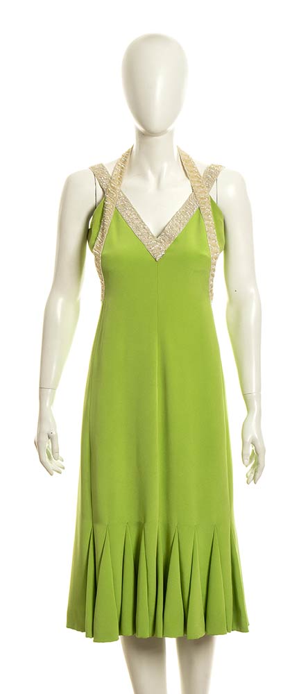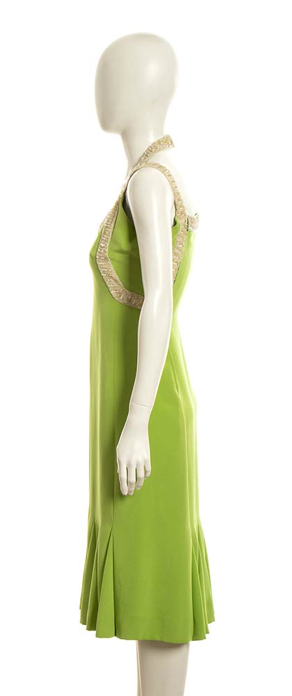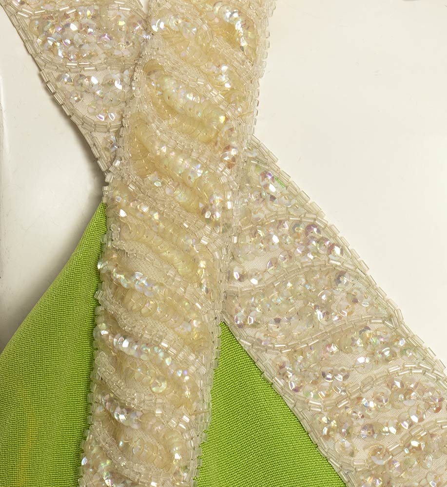 Abito in seta verde chiaro, profili ricamati con perline