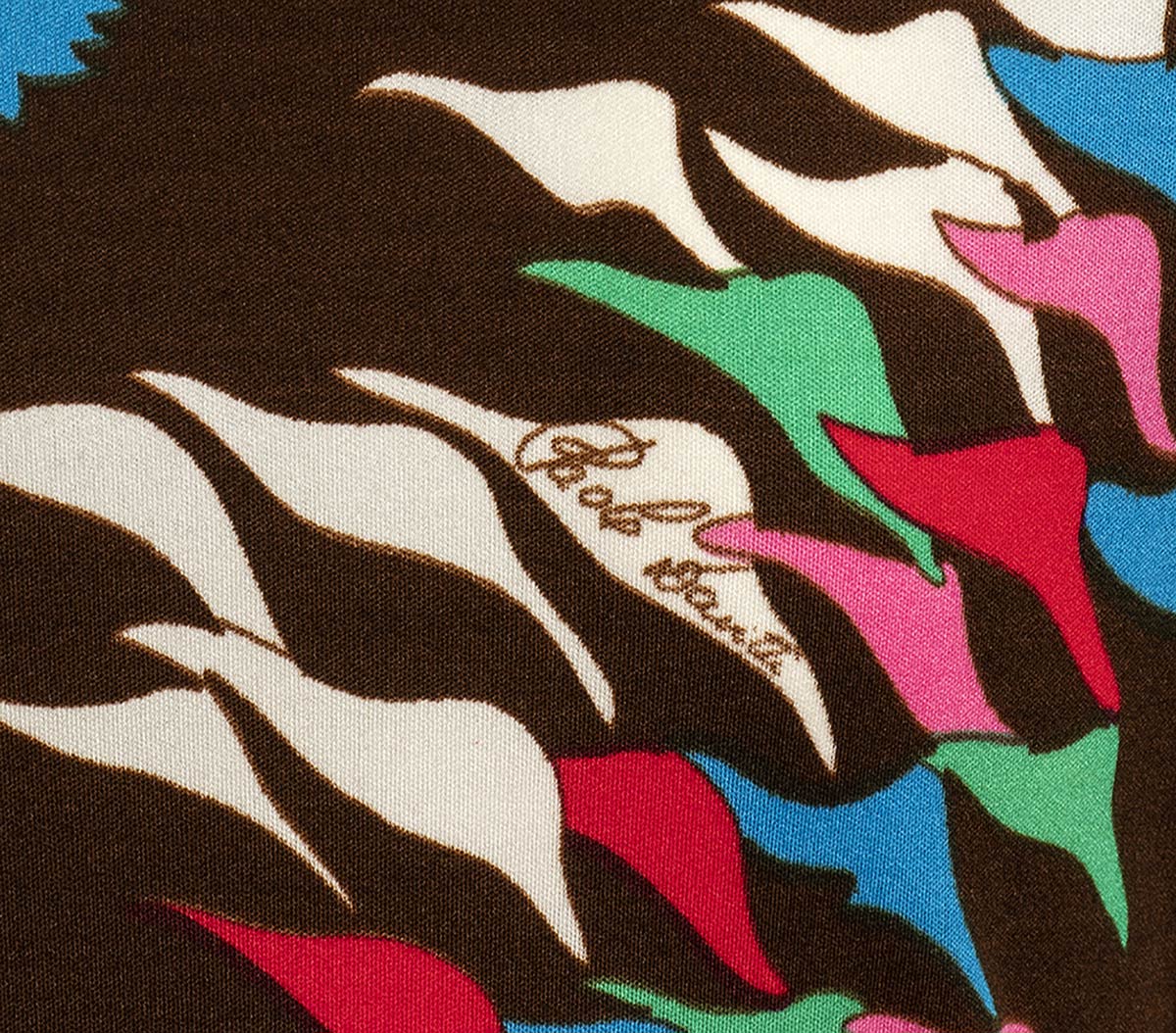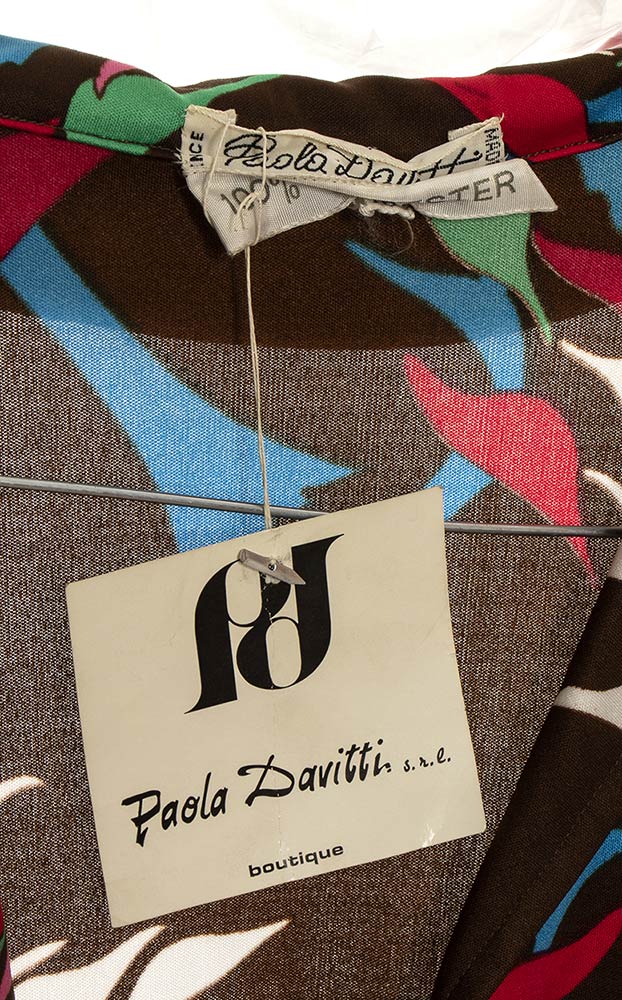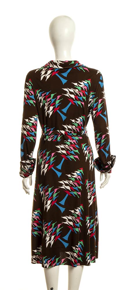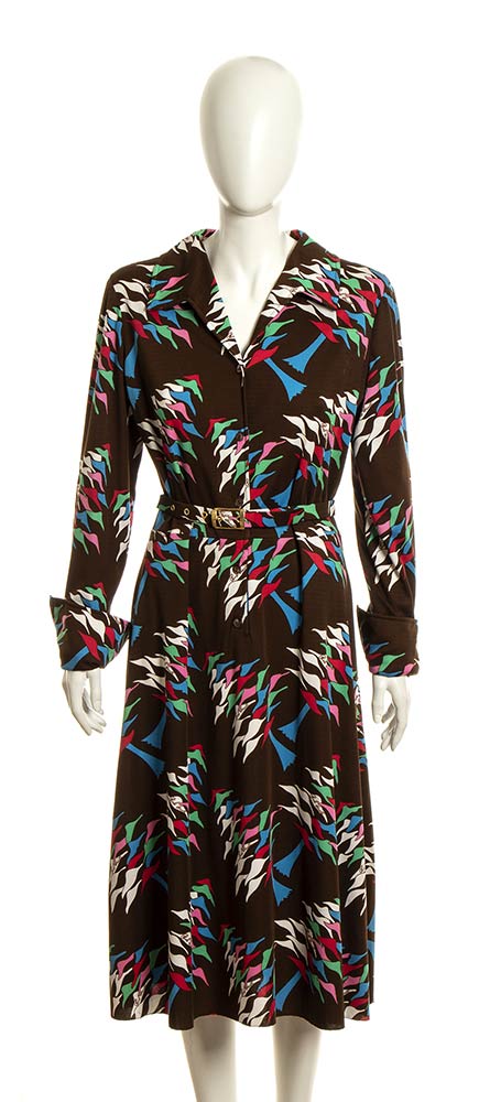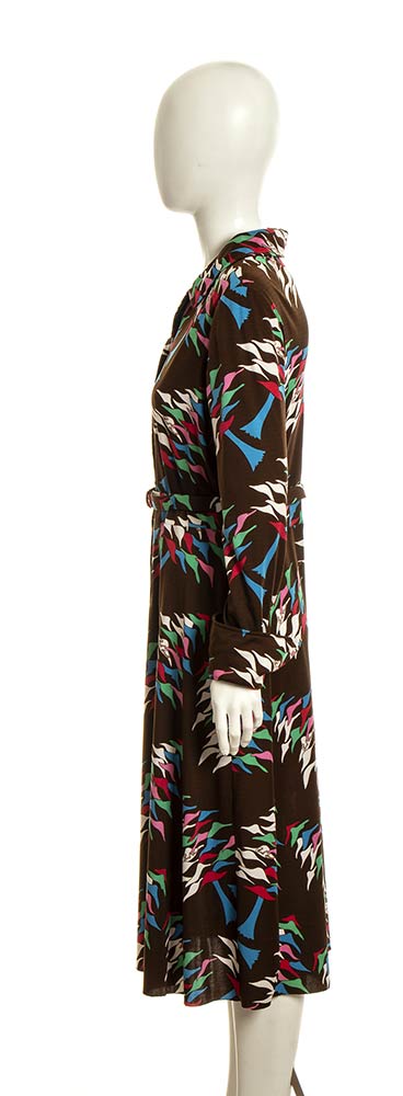 Abito in tessuto di poliestere fondo marrone, pattern con alberi astratti colorati, cintura