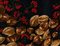 Gonna lunga (etichetta mancante) in velluto nero, pattern con frutti autunnali