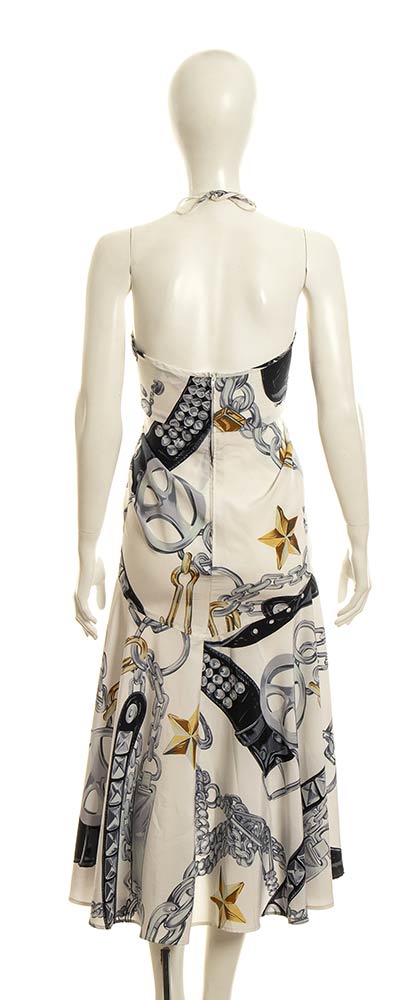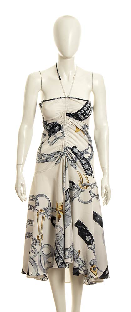 Abito in seta fondo bianco motivo "foulard", corpino arricciato