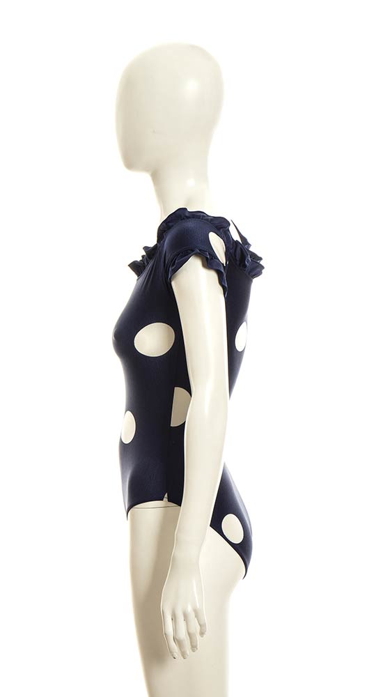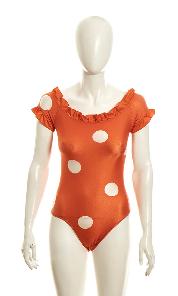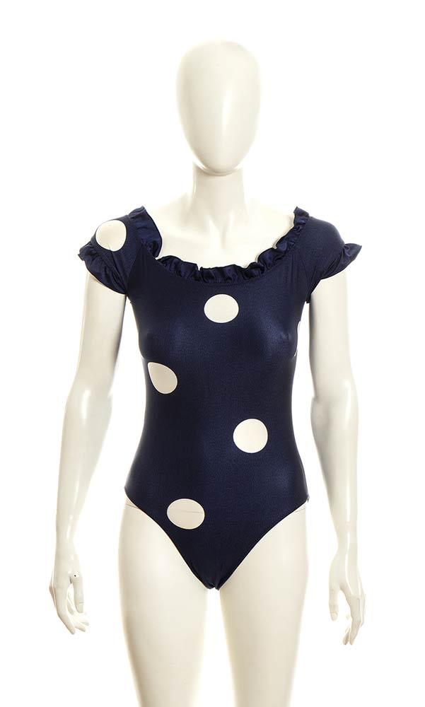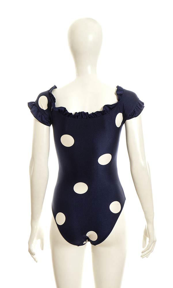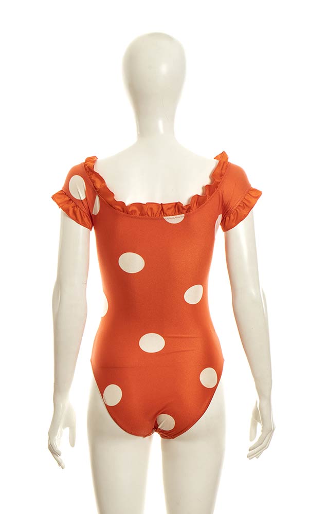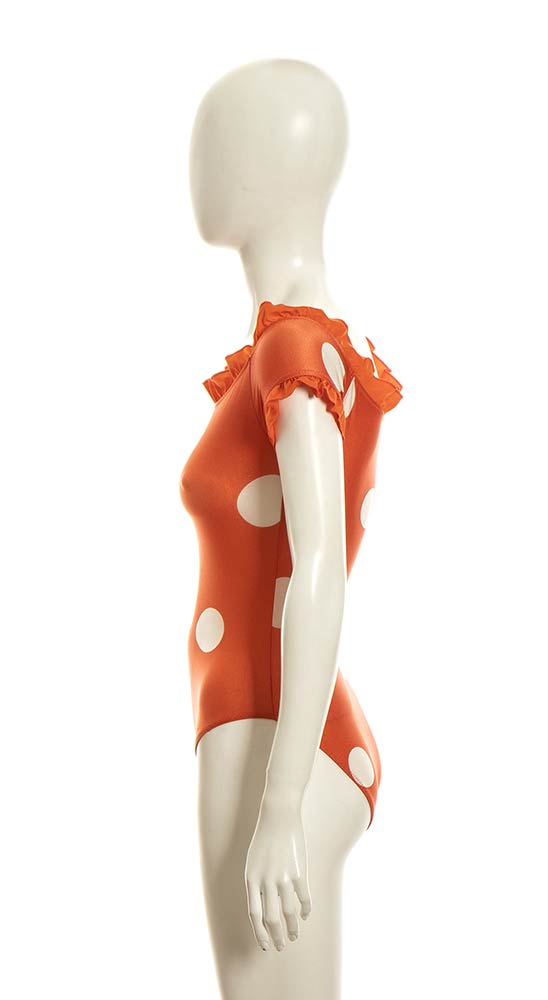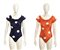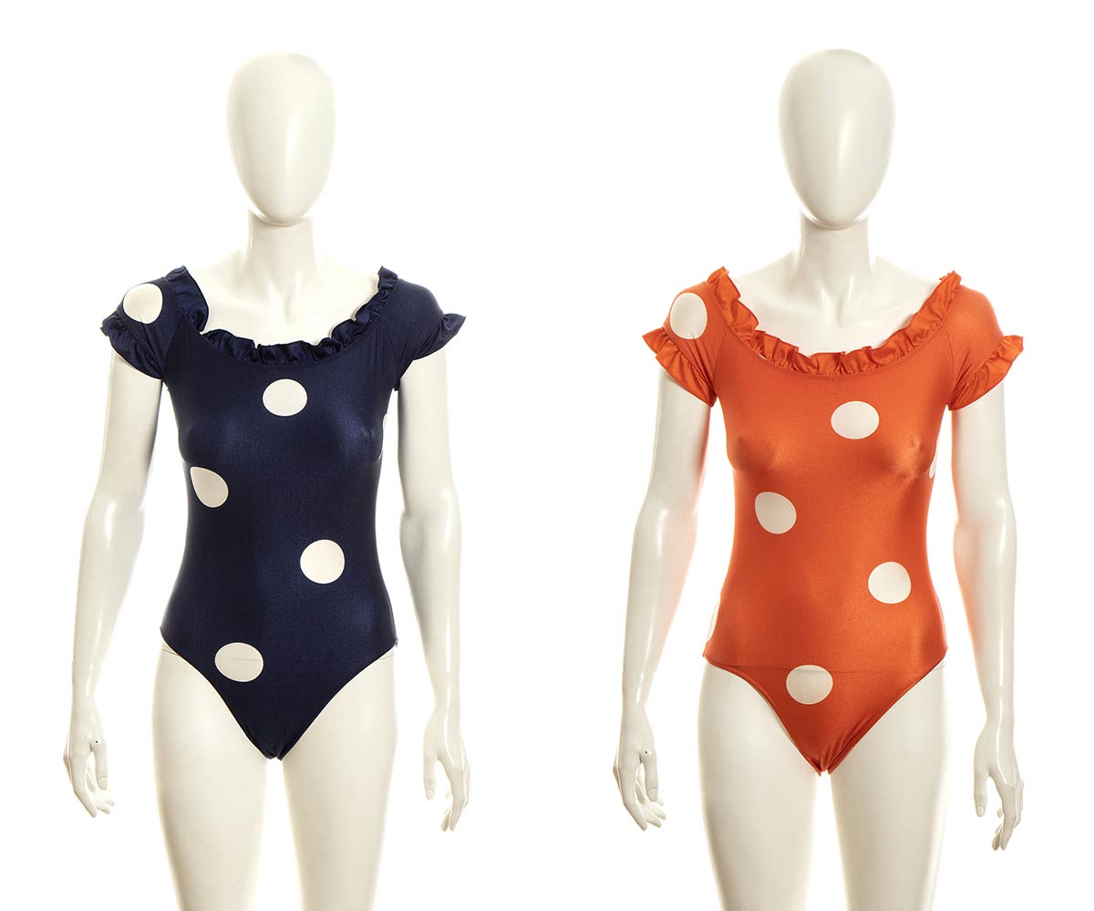 Lotto di 2 costumi interi in lycra arancione e blu con maxi pois bianchi