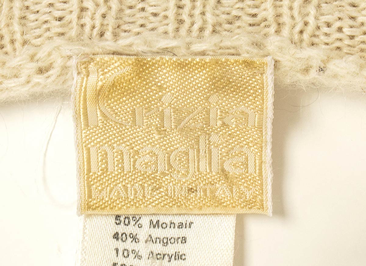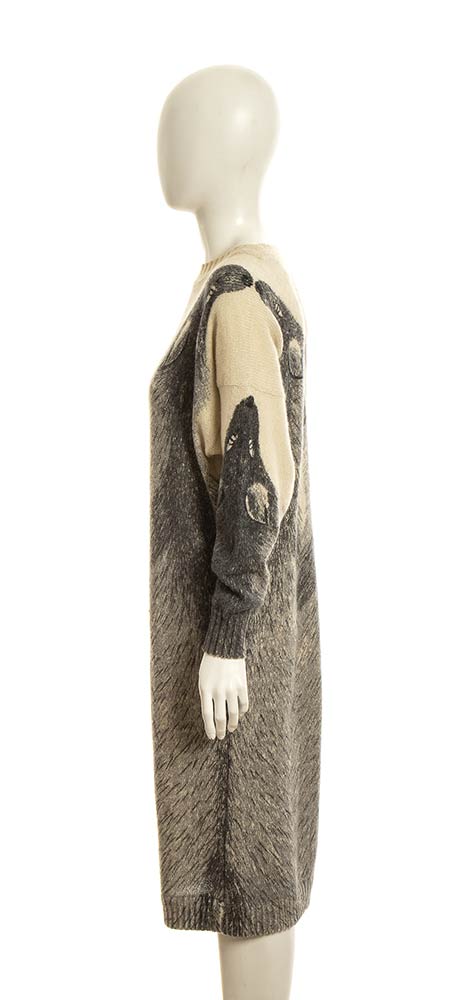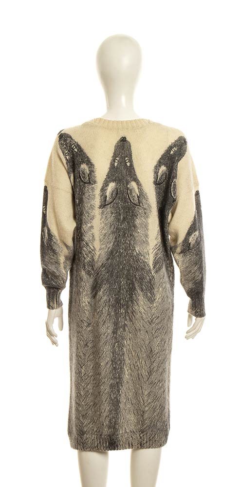 Abito in tessuto misto angora/mohair color avorio e grigio, pattern con volpi