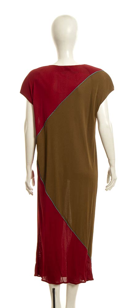 Abito in viscosa rossa e marrone, dettaglio con cordonetto turchese