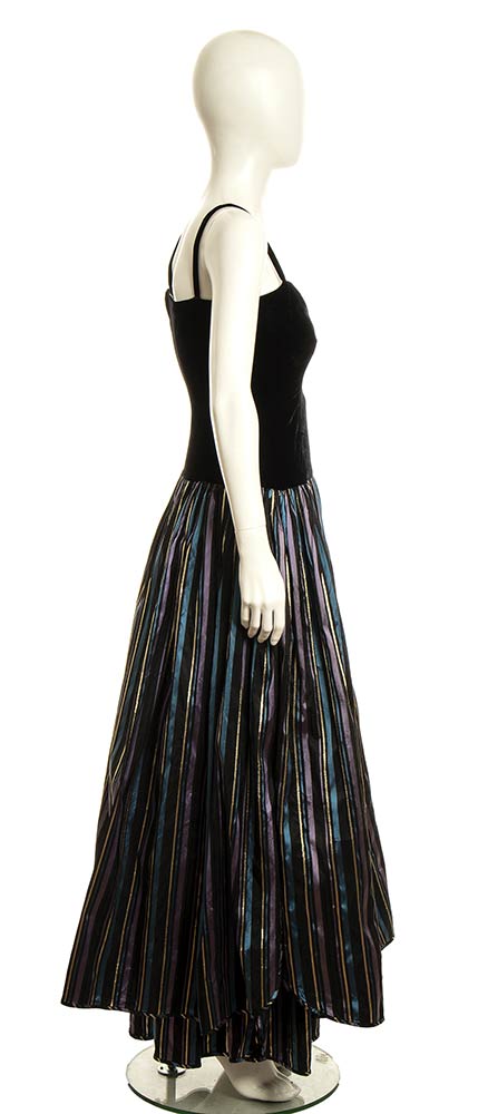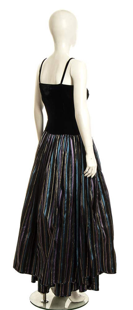 Abito da sera corpino in velluto nero gonna in taffeta a righe