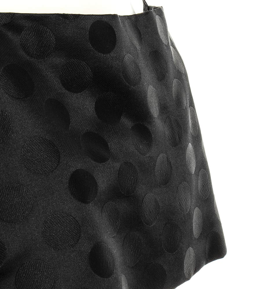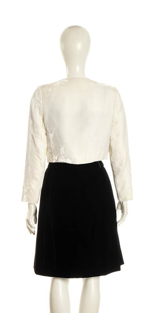 Completo in velluto nero, seta jacquard nera con pattern a pois, bolero in velluto bianco