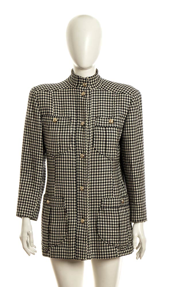 Giacca in lana pied de poule bianca e nera, bottoni dorati