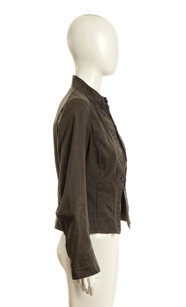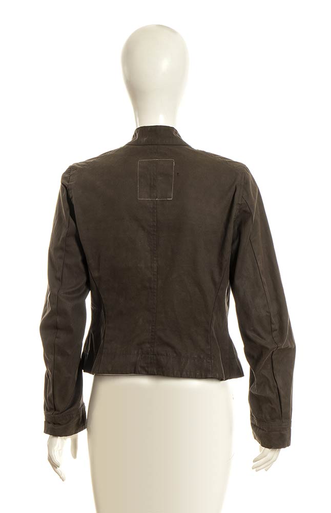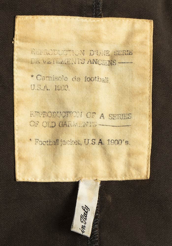 Giacca in tela di cotone color cachi, leggera ceratura. “Reproduction of a series of old garments Reproduction d'une serie de vetements anciens, camisole da football Usa 1900. Football jacket”
