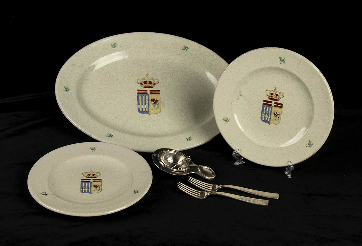 Lotto di due piatti piani e di un piatto grande ovale da portata in ceramica, firmati al retro ICARO RODI, con stemma del Governatore di Rodi Sua eccellenza Cesare Maria de Vecchi. Il lotto si compone ancora di due posate e di un passino per thé marcati BROGGI MILANO, in metallo argentato con stemma del Governatore. Periodo 1936-1945. I piatti misurano cm.24 di diametro, il piatto da portata cm.40x30. In buone condizioni, senza danni o mancanze alla ceramica