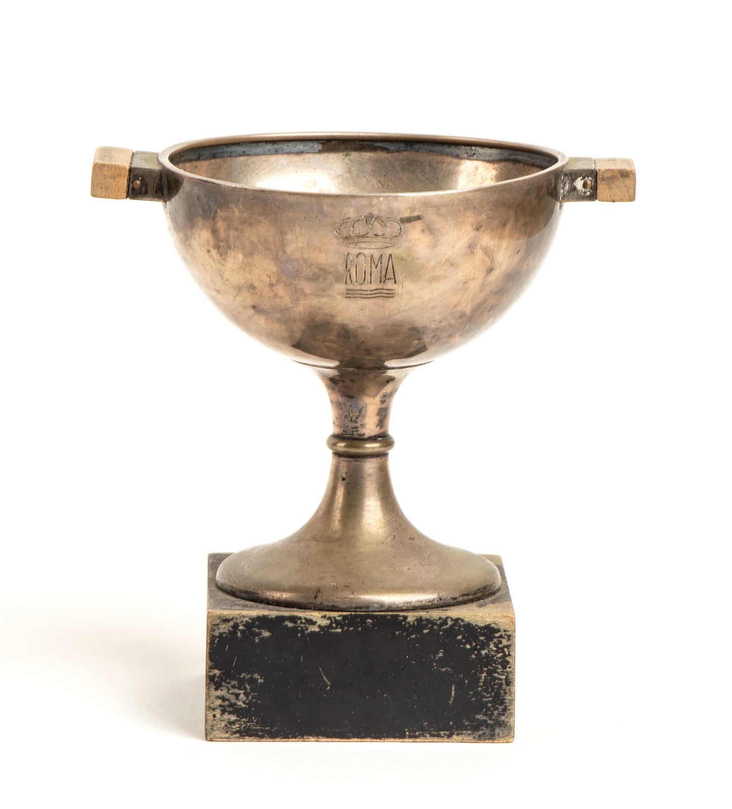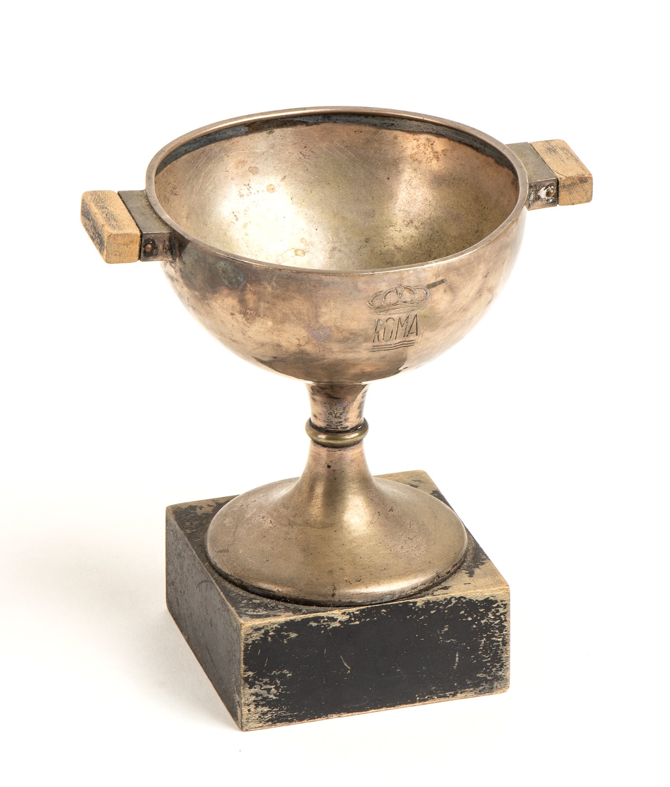 Coppa in argento dal servizio di bordo del transatlantico ROMA , firmata F. BROGGI con punzone 800. Stile deco, reca la scritta ROMA su delle onde marine, sormontata da una corona reale. 1926-1932. Misura totale senza base cm.10 in altezza, in buone condizioni. Marcata F.BROGGI 800