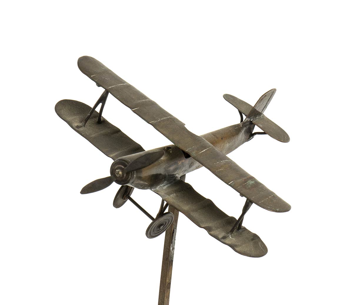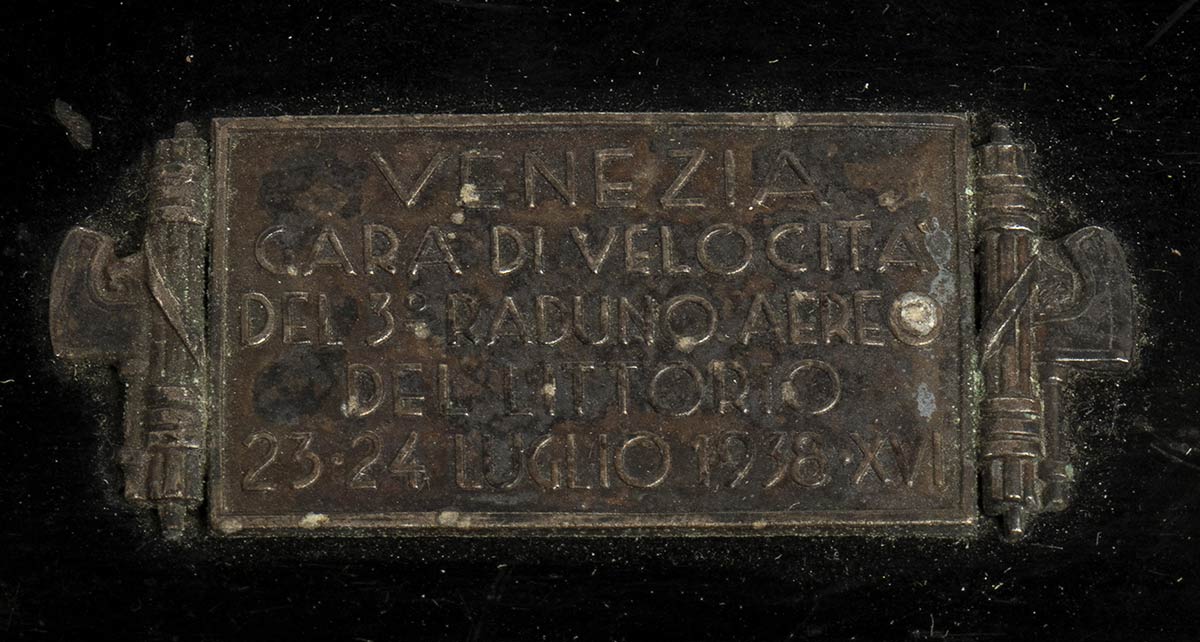 Modello di aereo biplano, probabilmente FIAT CR20, in metallo scatolato, poggiato su supporto verticale sfilabile su base portapenna in ebano, con targhetta in lamierino che recita VENEZIA - GARA DI VELOCITA' DEL 3' RADUNO AEREO DEL LITTORIO - 23.24 LUGLIO 1938 - XVI con ai lati due fasci littorio. Originale dell'epoca, non moderno. Elica girevole. Misure dell'aereo circa cm.12x10 , della base circa cm.16x10. Discreto stato