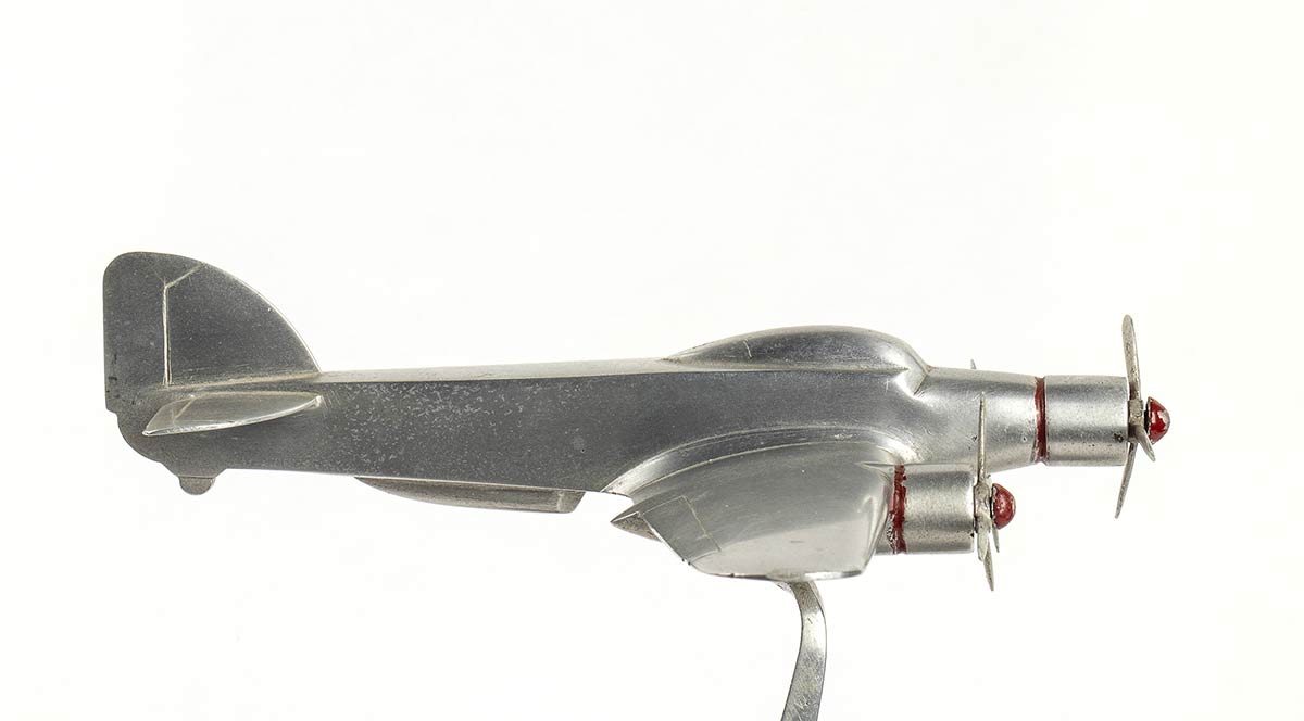 Modello di Savoia Marchetti SM79 poggiante su base da scrivania, stile decò, con donna stilizzata. In fusione di alluminio, materiale autarchico, con tre eliche girevoli. Originale dell'epoca, non moderno. Dimensioni dell'aereo cm.20x16, altezza della donnina cm.25. Insieme in buono stato.