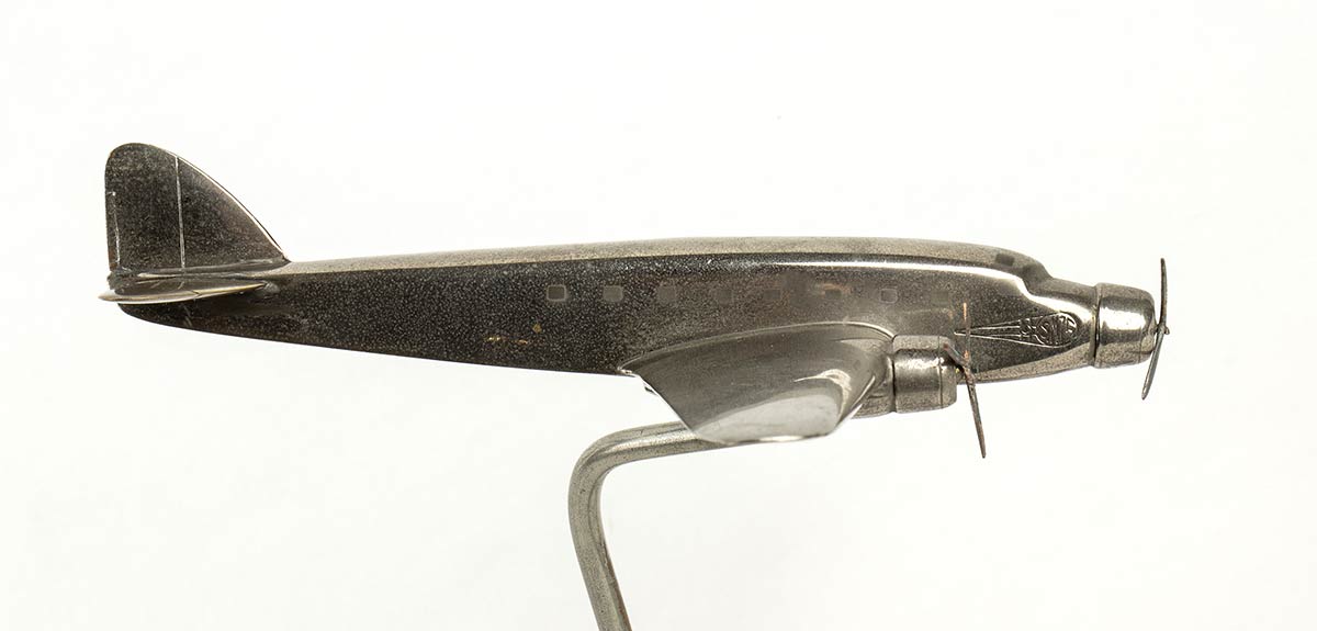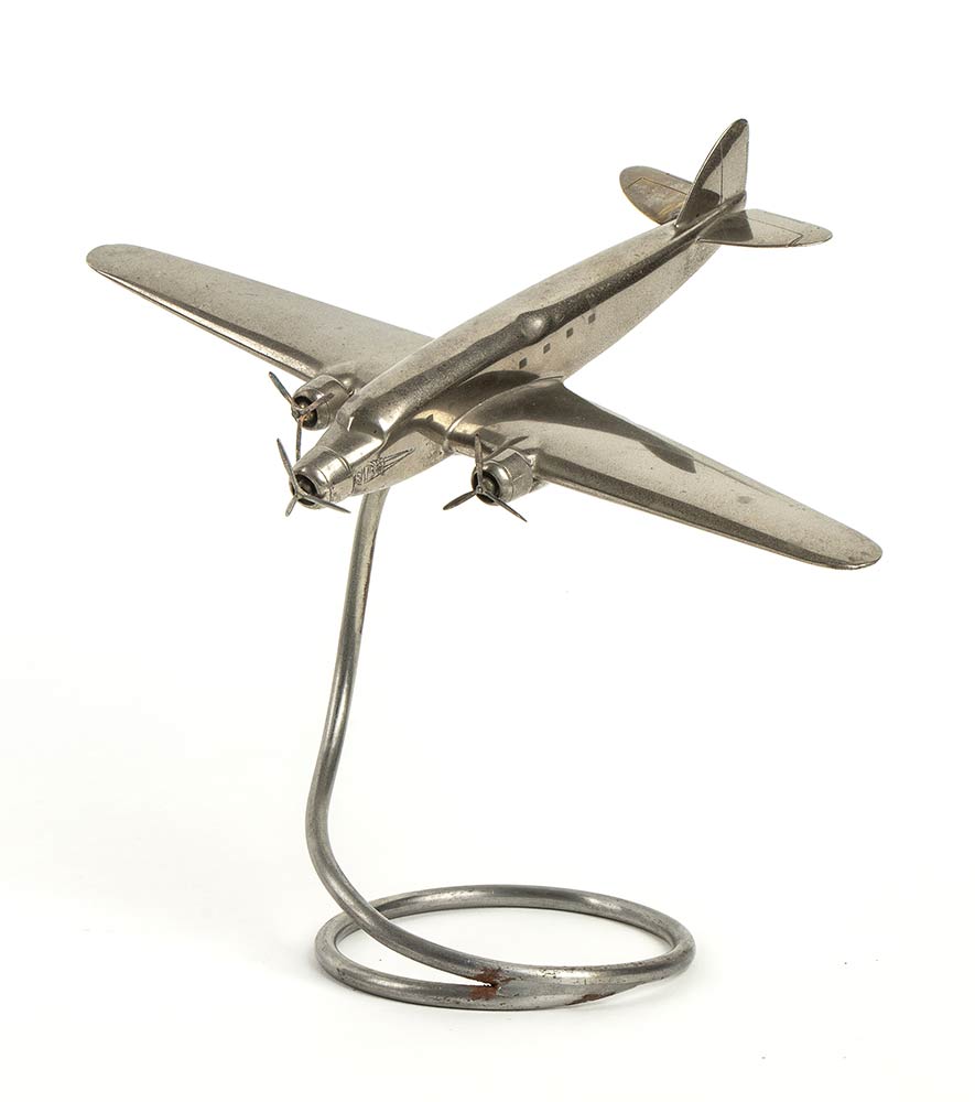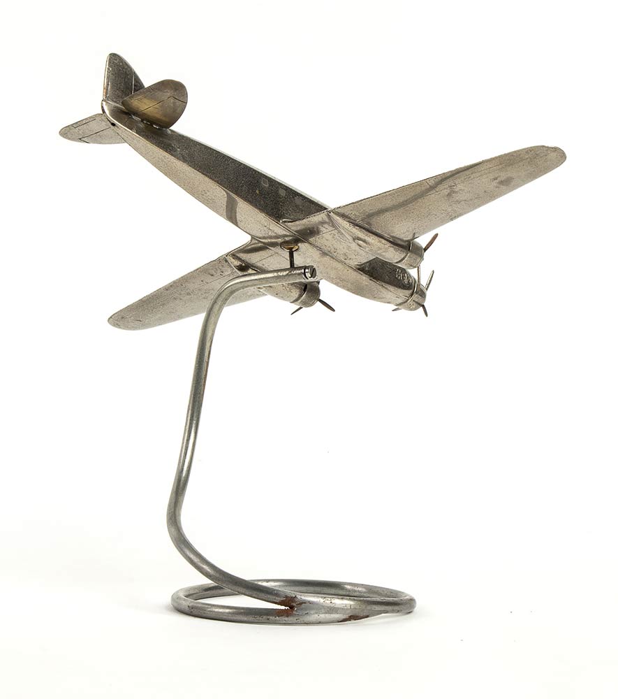 Originale dell'epoca, non moderno. Dimensioni dell'aereo cm.20x15, altezza della base circa cm.10. Lieve ammaccatura al lato sinistro della fusoliera, insieme in buono stato.