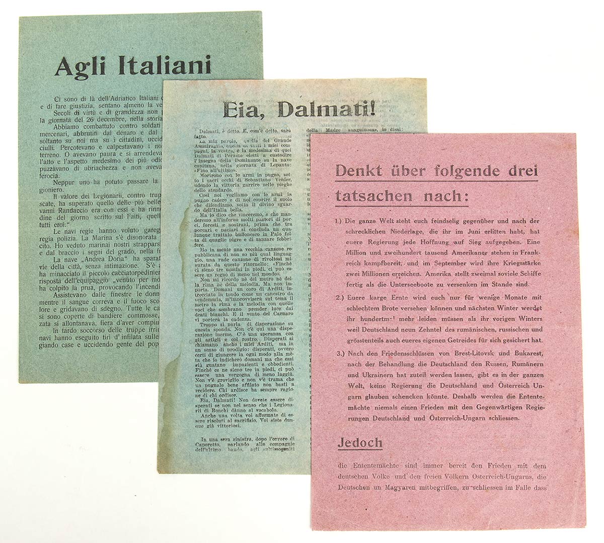 Lotto di tre volantini : volantino ciclostilato bifaccia, su carta leggera di colore verde, fatto stampare all'indomani del Natale di Sangue, dal titolo "AGLI ITALIANI" , dove d'Annunzio disonora gli italiani che hanno aggredito i propri fratelli, con il bombardamento dalla nave Andrea Doria, datato 26 Dicembre 1920, misura cm. 24x16; volantino in carta leggera verde, dal titolo "EIA DALMATI" datato 16 Ottobre 1920, misura cm.25x17; volantino "Denkt über folgende drei Tatsachen nach" (Meditate queste tre verità ... rivolgendosi al popolo viennese criticando il governo tedesco e affermando che "i vostri figli, i vostri mariti, i vostri padri, sono costretti a sanguinare e a morire...") misura cm. 25x17. Lotto in buone condizioni