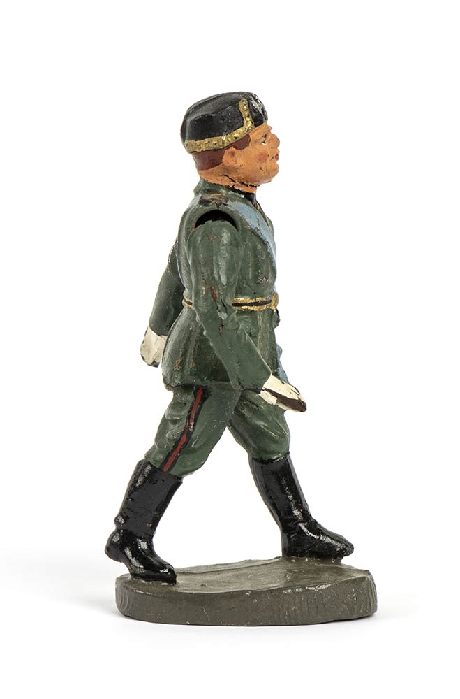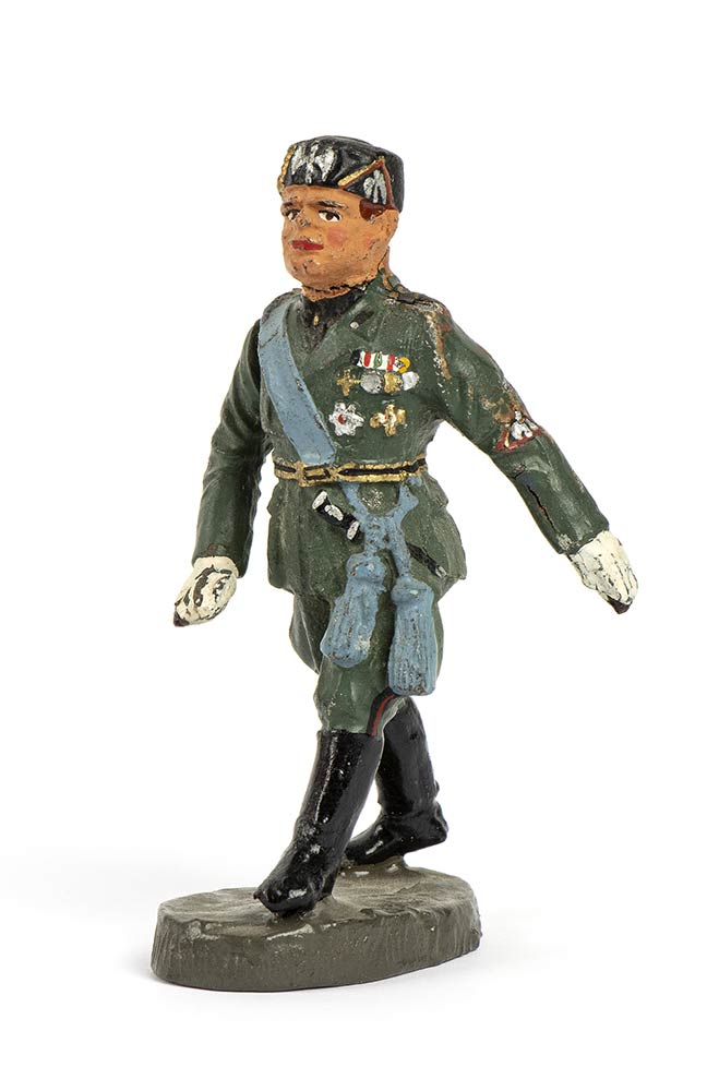 Figurino del Duce Benito Mussolini,in marcia, con braccio destro mobile per simulare il saluto fascista.In uniforme da Primo Caporale della Milizia con Fez fascista in testa. Anteguerra, misura standard circa cm 7,5 / 8 . In buone condizioni con eventuali segni d'uso ed accettabili mancanze.