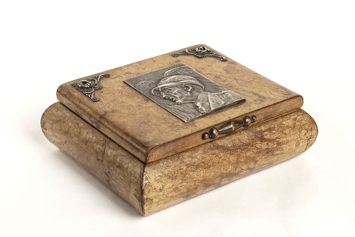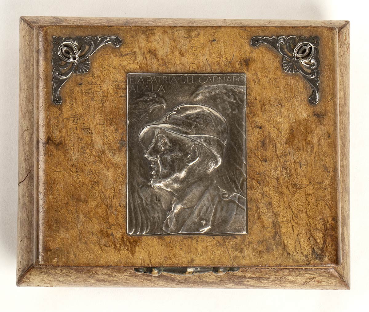 Scatola portagioie in legno chiaro, con ricami probabilmente in argento applicati ai due angoli superiori, e placchetta uniface in argento punzonato 800, raffigurante Gabriele d'Annunzio di profilo con berretto all'alpina da Colonnello, e didascalia che recita EIA PATRIA DEL CARNARO ALALA' ! - La placchetta riproduce il verso della medaglia disegnata da Giannino Castiglioni, per la reggenza del Carnaro, periodo fiumano 1920-1921. La scatola misura circa cm.17x14x6, la placca circa mm.58x78. In buonissime condizioni