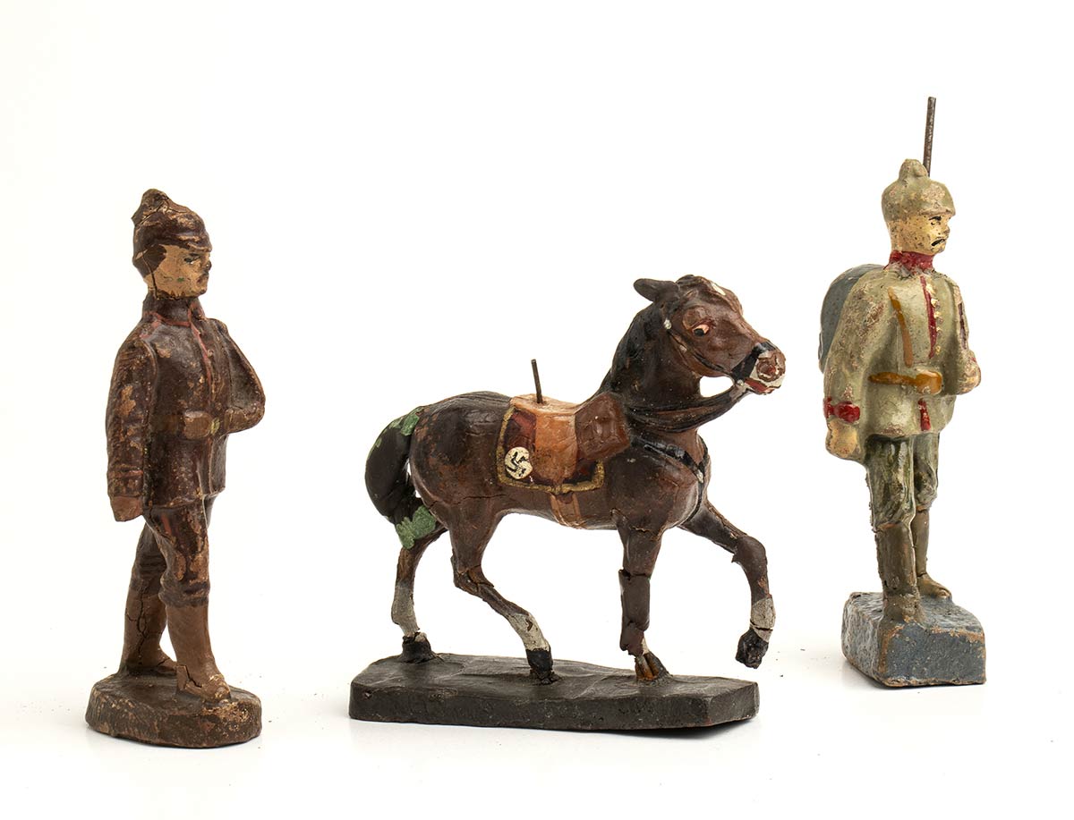 Lotto di 2 soldatini prussiani o austriaci, Prima Guerra Mondiale, ed un cavallo con gualdrappa dai simboli nazisti. Anteguerra, in composizione/pasta, con mancanze, rotture ed evidenti tracce d'uso, condizioni mediocri. Altezza soldatini circa cm.12
