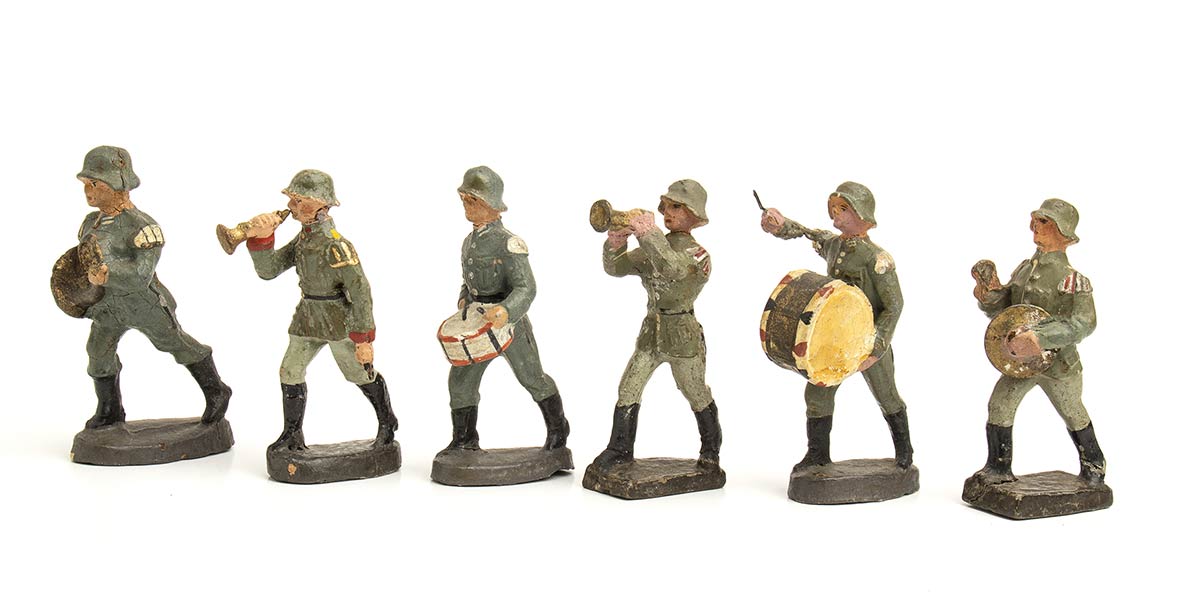 Lotto di 6 soldatini, elementi di banda musicale, a cavallo. Anteguerra, in composizione/pasta. Mancanze, ed evidenti tracce d'uso, condizioni discrete. Altezza circa cm.7