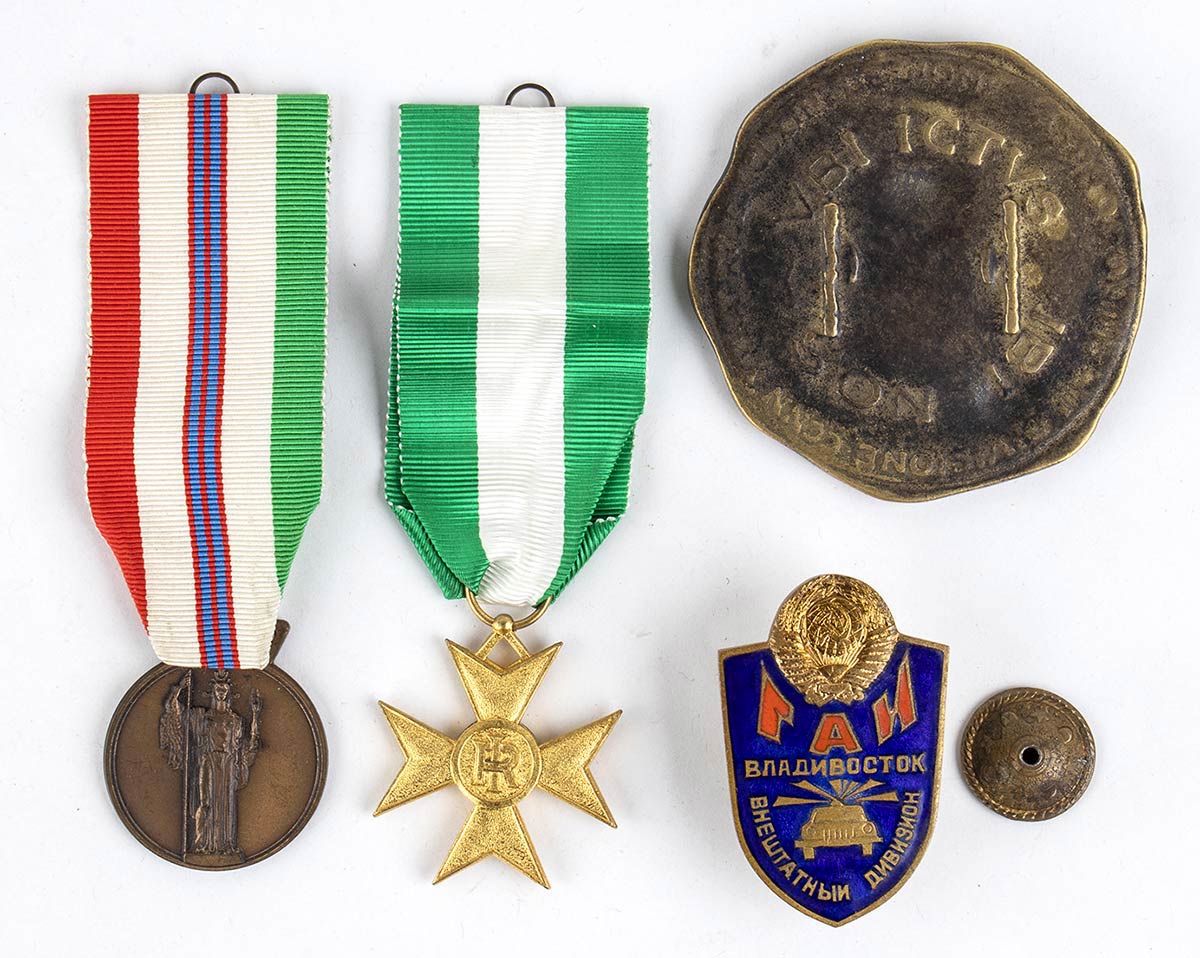 lotto di due medaglie post belliche, un distintivo sovietico, una grande medaglia in fusione delle camicie nere in Africa ed una scatola in marocchino verde con impressioni in oro.
