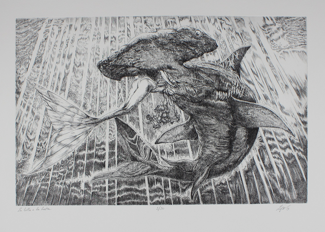 Perfetti Luciano La bella e la bestia acquaforte su carta, cm. 50x70, es. 1/30 firmata in basso a destra, intitolata in basso a sinistra