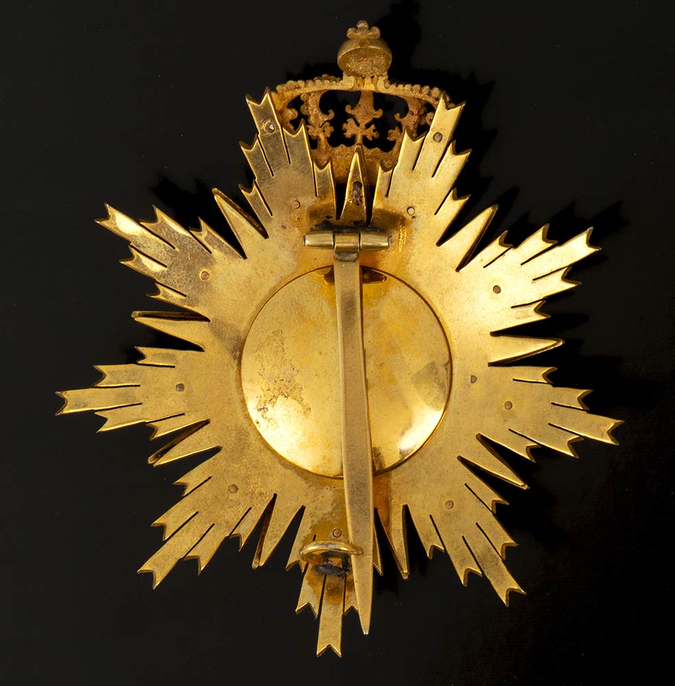 Placca ad otto raggi in argento dorato con applicata tramite rivetti stella a sette punte in smalto bianco contornata di stelle in smalto bianco sotto corona reale, bellissima ed antica fattura