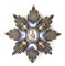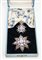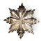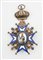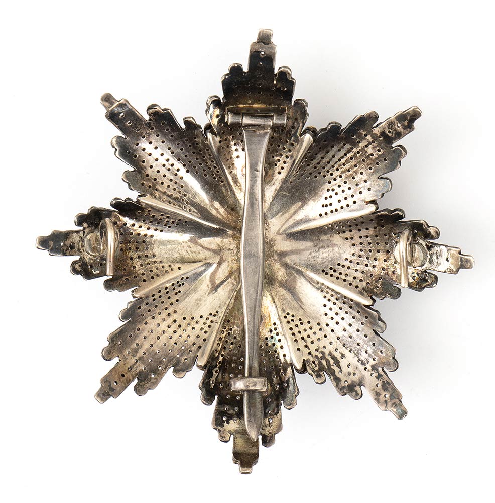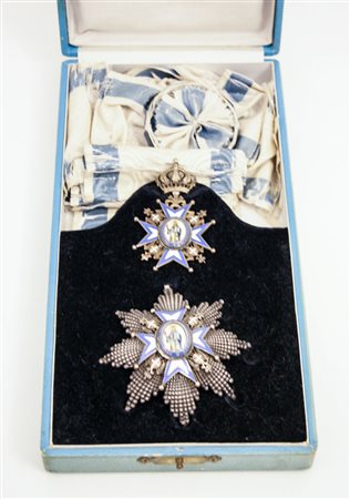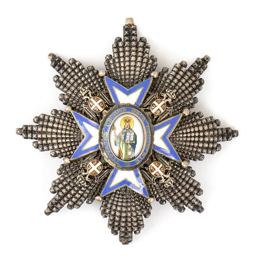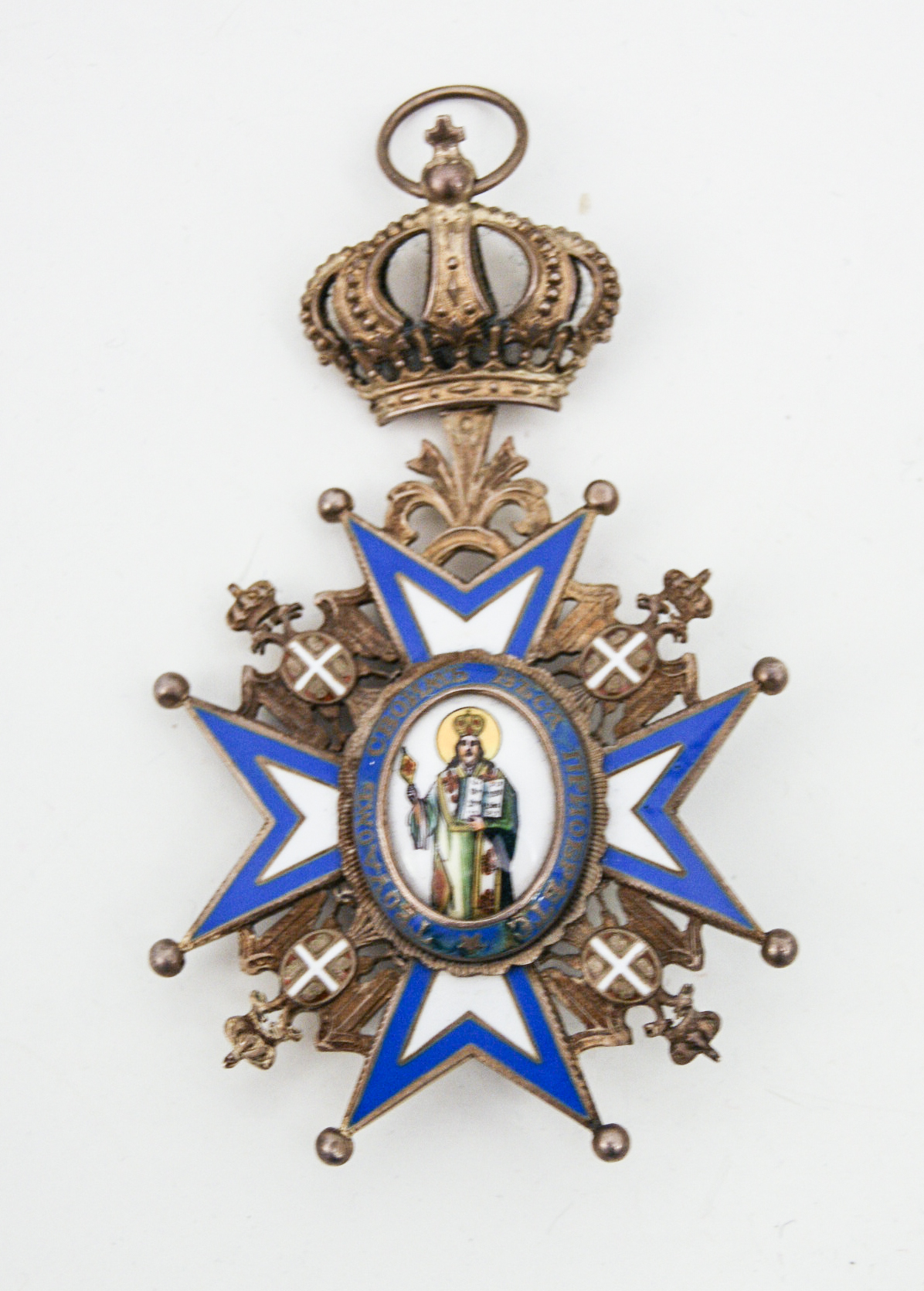 Placca in argento gettato, traforato e cesellato con applicata croce inquartata con aquile bicipiti e santo in vesti verde, azzurro, al verso spillone centrale accostto a due ganci laterali, pendente in argento dorato e smalti, santo in veste verde azzurra, nastro di seta rovinato in più punti , liso e sfilacciato, conservata in astuccio produttore Huguenin & co, Le Locle, Suisse