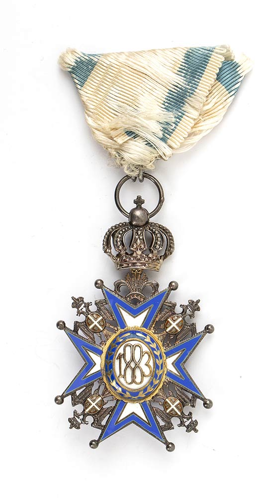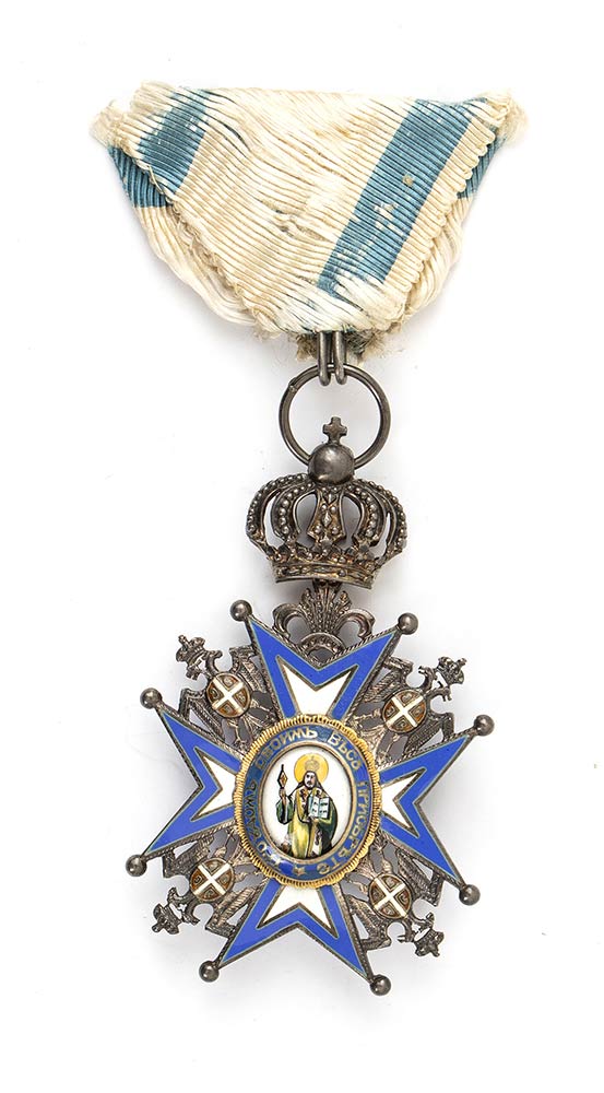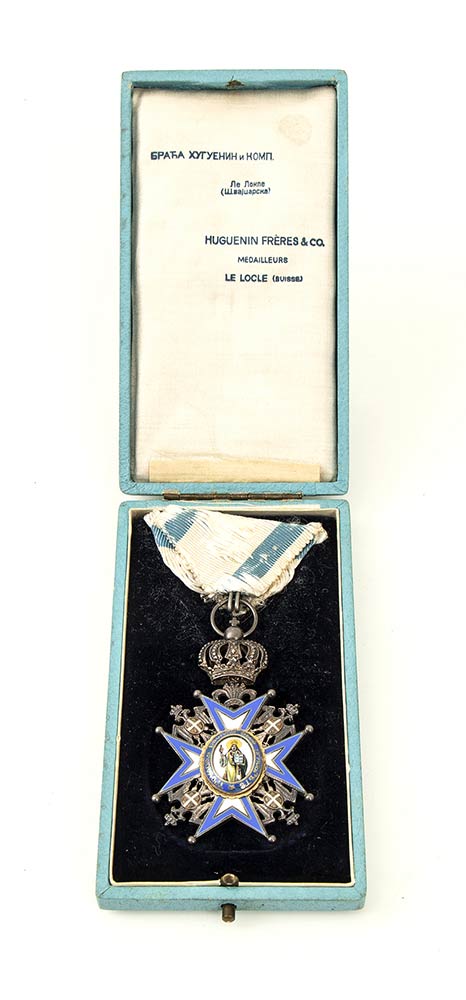 Serbia, prima metà XX sec. Insegna di quinta classe, argento e smalti,vesti del santo in verde, nastro coevo, conservata in astuccio, produttore Huguenin & co, Le Locle, Suisse