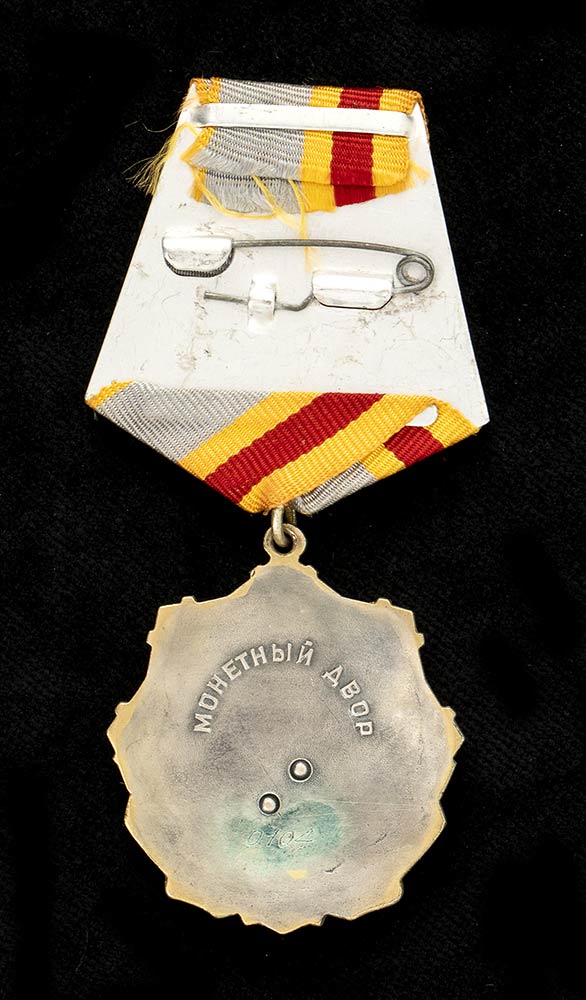 argento dorato e smalto rosso, con falce e martello applicata con due rivetti,zecca di Dvor, numero di concessione 104 con libretto personale dell'insignito