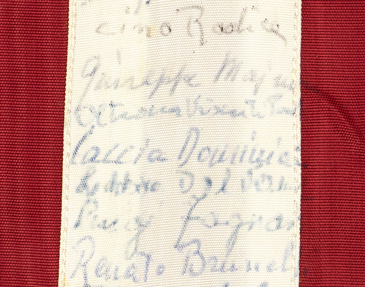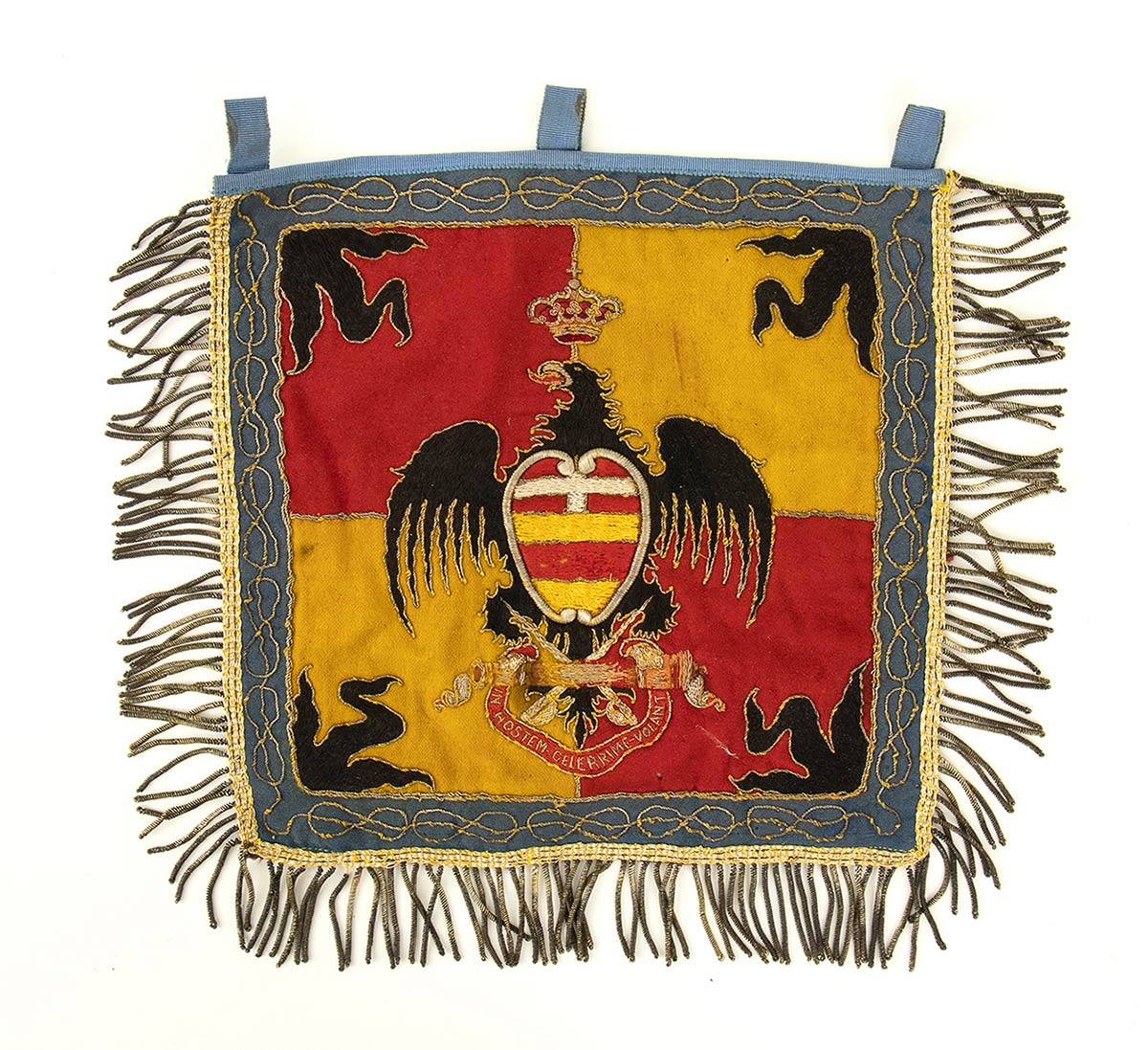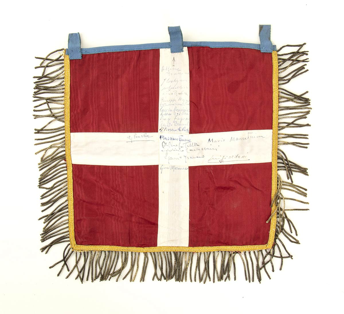 Bellissima drappella in panno di lana con ricami in cotone e filato metallico, frangia di grovigliola con attacchi alla tromba di gros grain azzurro,al verso scudo Savoia di seta marezzata con firme di ufficiali, tra cui, leggibile, quella di Caccia Dominioni