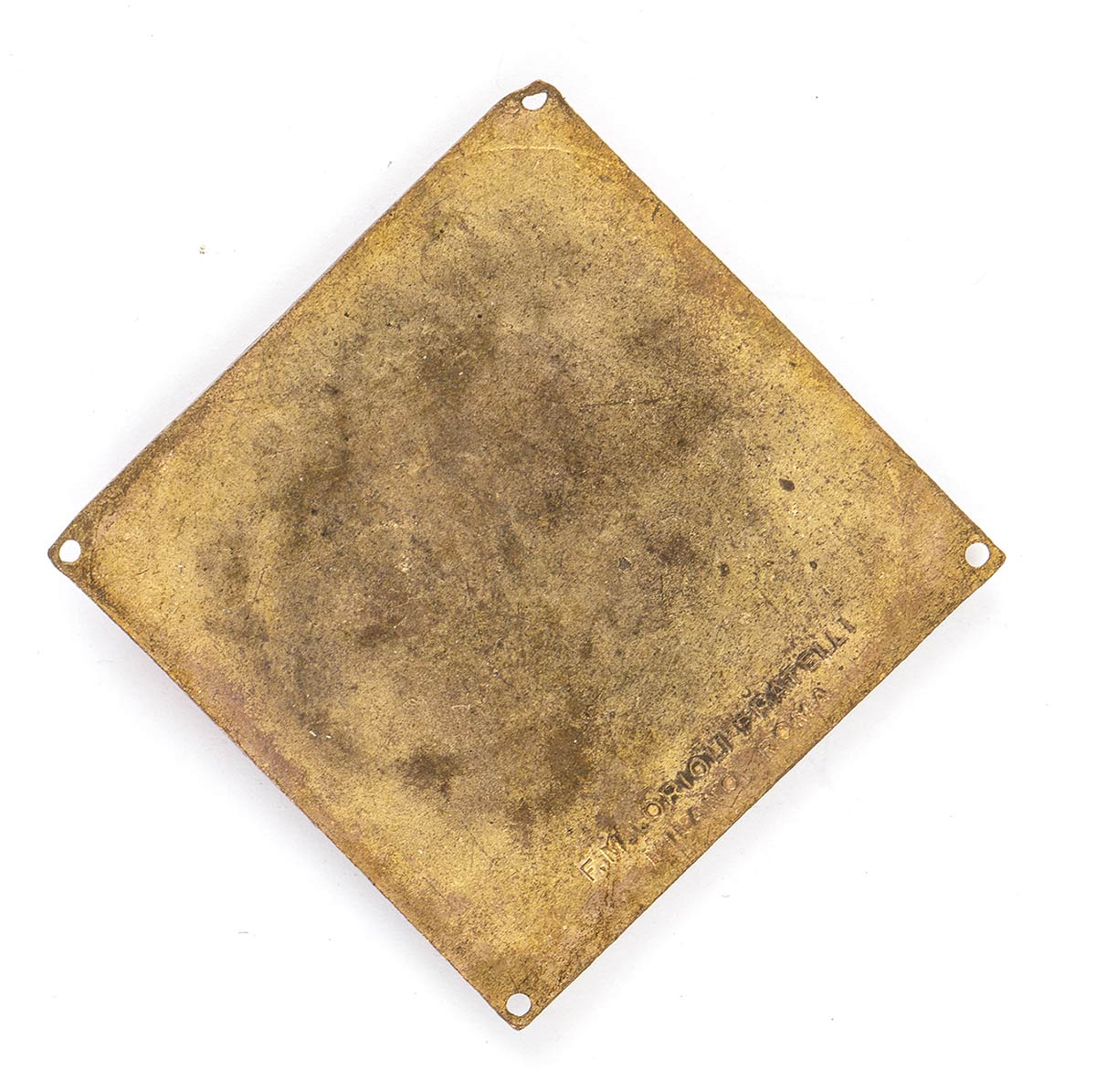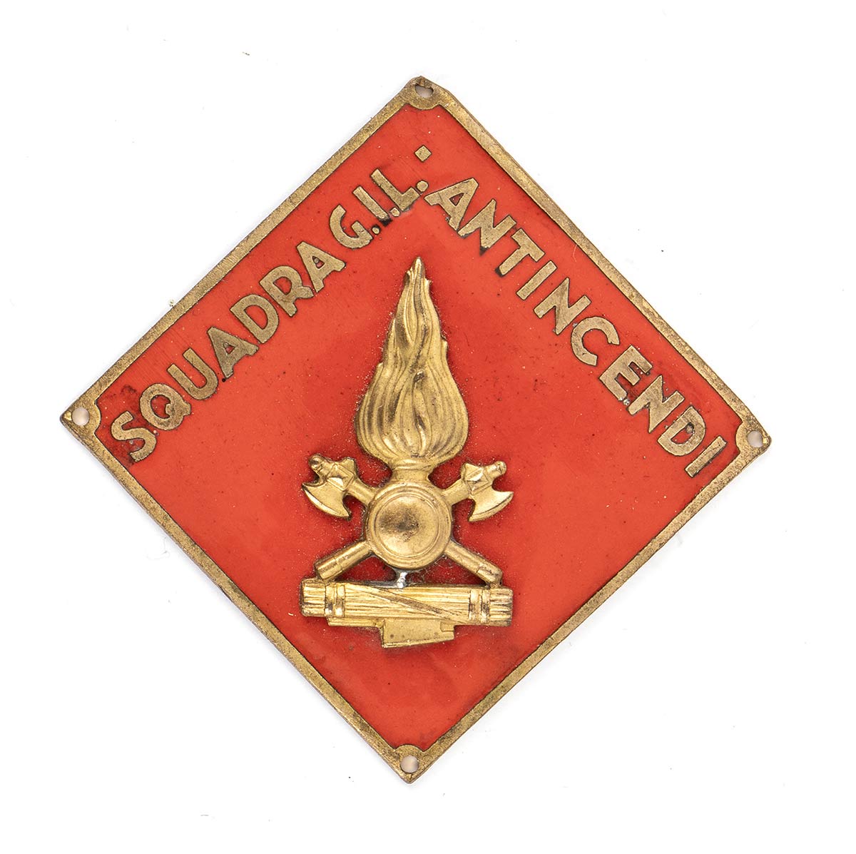 bronzo dorato e smalto rosso, bel distintivo della Gioventù Italiana del Littorio addetta ai servizi antincendio, al v erso marchio del fabbricante Lorioli, ottimo stato 40X40 mm