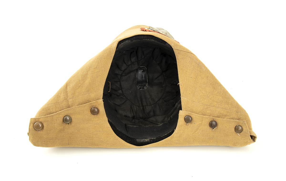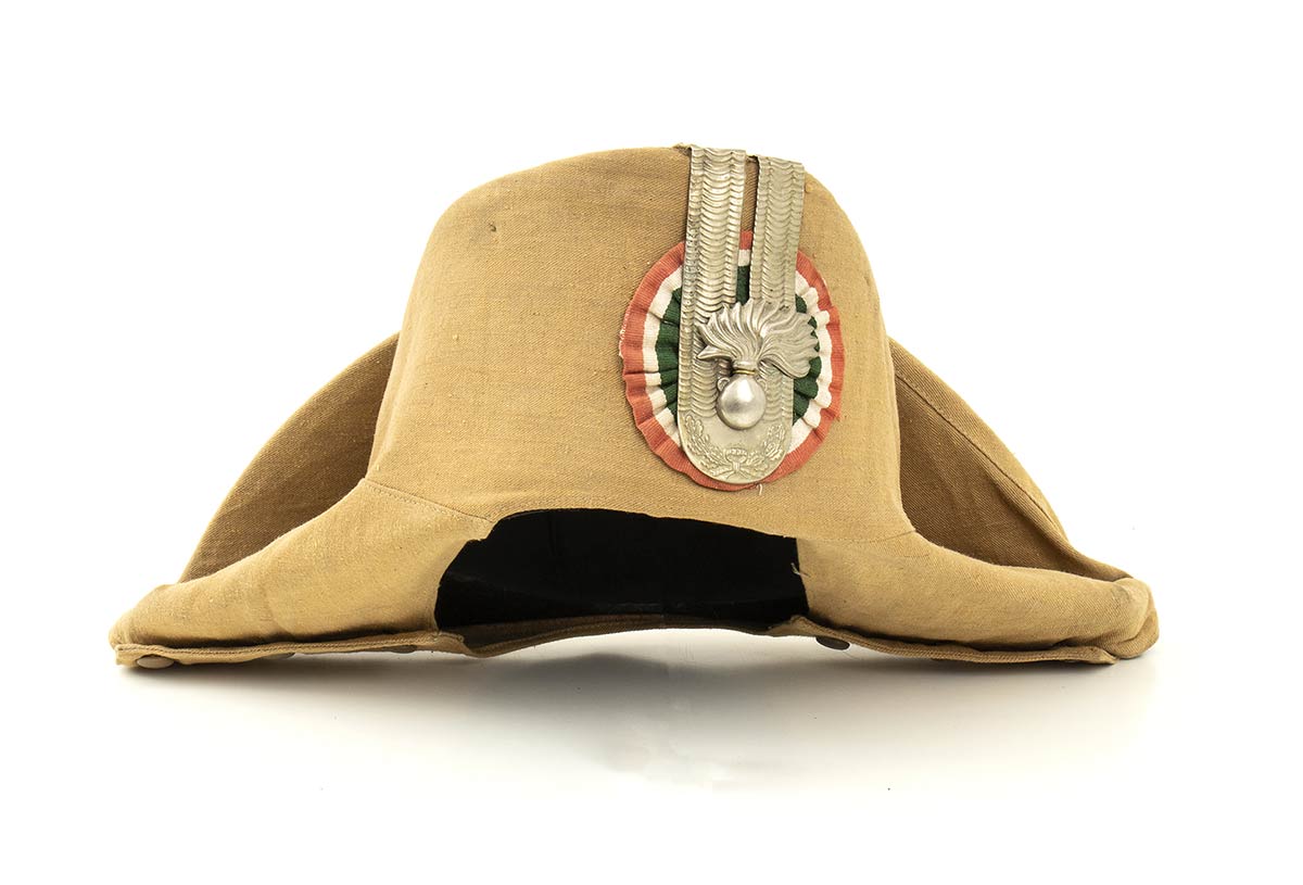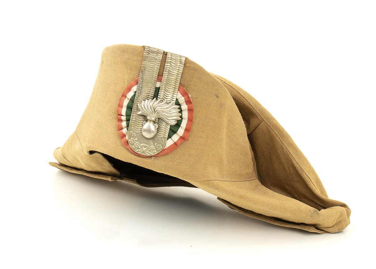 Rarissima lucerna coloniale utilizzata durante le operazioni in Palestina,agli inizi degli anni 20 i fregi metallici e la coccarda sovrapposta al telino la caratterizzano come copricapo coloniale, in quanto il telino di tela Massaua è fissato al copricapo con cuciture, l'alluda all'interno è di tela per climi tropicali, interno in tela di cotone nera