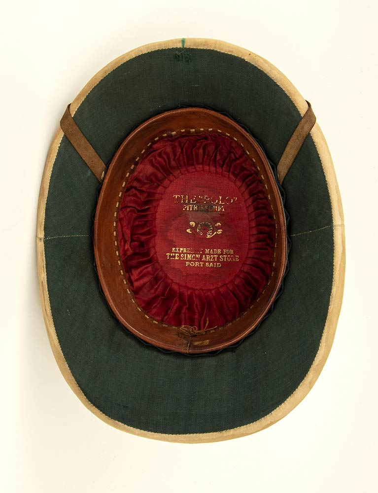 casco in midollo di palma ricoperto di tela di cotone, bel fregio metallico del genio alpini