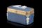 Scatola ottagonale in porcellana Wedgwood, a fondo azzurro con fiori e putti bianchi in rilievo, profilo della chiusura e cerniere in oro 9K a due colori (cm 7,6x3,9x4 ca)