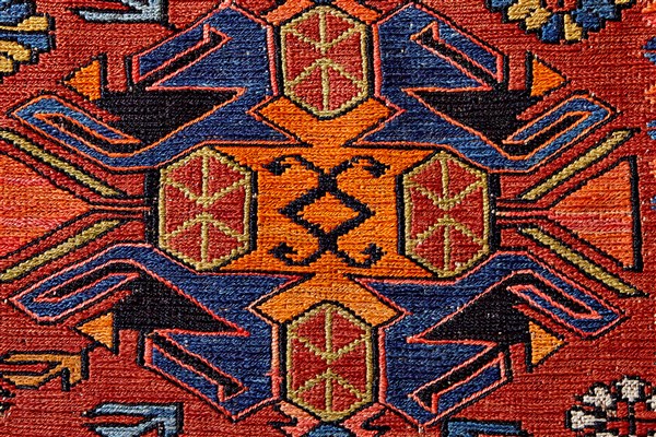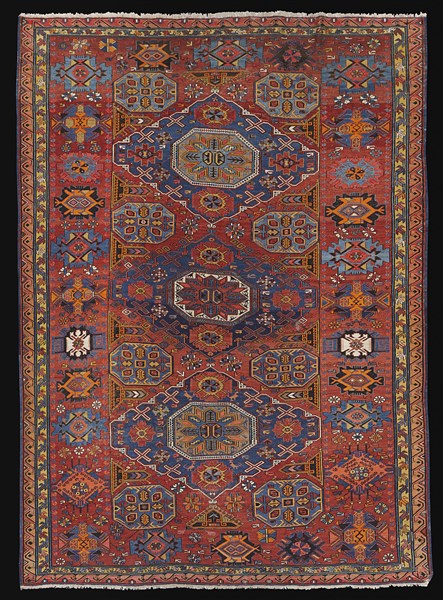 Tappeto Sumak, Caucaso, inizio secolo XX. Decoro con tre medaglioni romboidali nei toni del blu, arancio, marrone, azzurro, giallo su fondo mattone scuro su cui compaiono otto Gul di grandi dimensioni a fondo azzurro, le forbici dei Perepedil e numerosi simboli animali e vegetali stilizzati. Cornici esterne con "cane che corre", quella interna a meandro su fondo giallo. Bordura principale di grandi dimensioni con medaglioni di varie fogge nei toni utilizzati per il campo, sempre su fondo mattone scuro (cm 331x247) (lievi difetti e piccoli restauri)