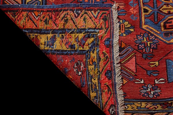 Sumak carpet, Caucasus, early 20th century. Decorated with three rhomboidal medallions in shades of blue, orange, brown, light blue, yellow on a dark background (331x247 cm) (minor defects and restorations)