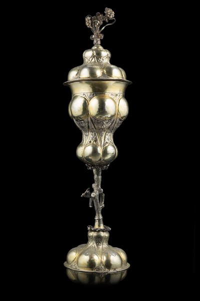 Coppa in argento bugnato e dorato con presa del coperchio a fiori, gambo raffigurante un ramo con un boscaiolo arrampicato. Germania, 1745 - 1748. Argentiere di difficile lettura (h. cm 34) (g 400 ca.) (difetti)