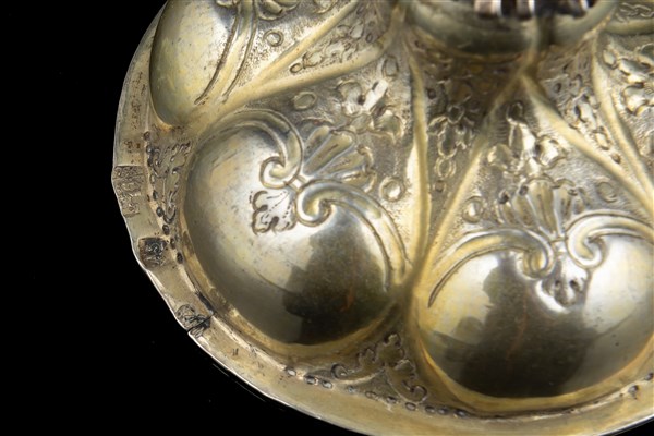 Coppa in argento bugnato e dorato con presa del coperchio a fiori