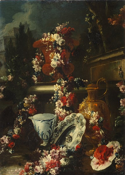 Francesco Lavagna (attr.) Composizione all'aperto con fiori, anguria e vasellam