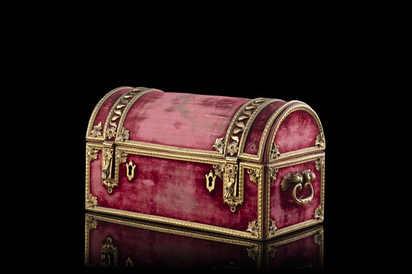 Piccolo forziere da viaggio in bronzo rivestito in velluto. Fregi cesellati a f