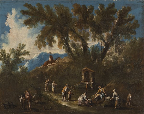 Paesaggio con viandanti in sosta presso un'edicola votiva