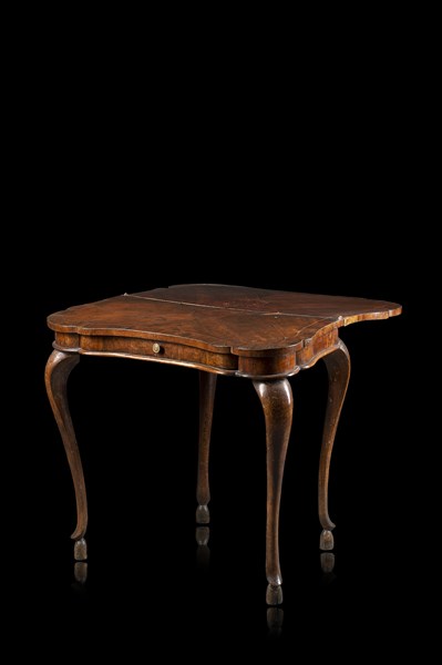 Tavolo da gioco di forma mossa lastronato in noce e filettato in legno chiaro, piano apribile centrato da cartella entro riserva sagomata, cassetto nella fascia. Gambe terminanti a zoccolo. Emilia, secolo XVIII (chiuso cm 81,5x76x41) (difetti e restauri)