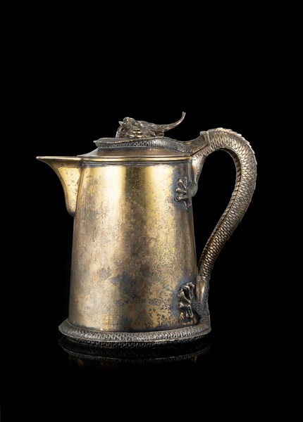 Boccale in vermeille, ansa e coperchio decorati in rilievo a dragone. Londra, 1875. Argentiere Robert Hennell IV (h. cm 22) (g 1000)