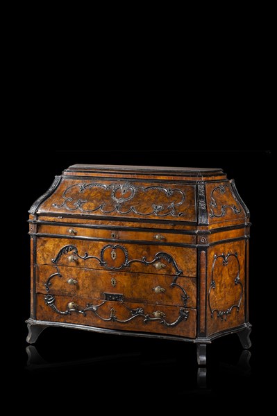 Ribalta di forma mossa lastronata in radica di noce, cartelle e profili in legno ebanizzato, tre cassetti sul fronte ed un altro sottopiano. La calatoia rivela quattro tiretti e anta centrale. Lombardia, secolo XVIII (cm 156x119x58) (difetti e restauri)