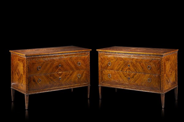 Coppia di cassettoni lastronati, intarsiati e filettati in legni vari. Fronte a due cassetti centrati come il piano e i fianchi da rosone entro riserva. Gambe rastremate. Piemonte, secolo XVIII (cm 139x94x63,4) (difetti e restauri)