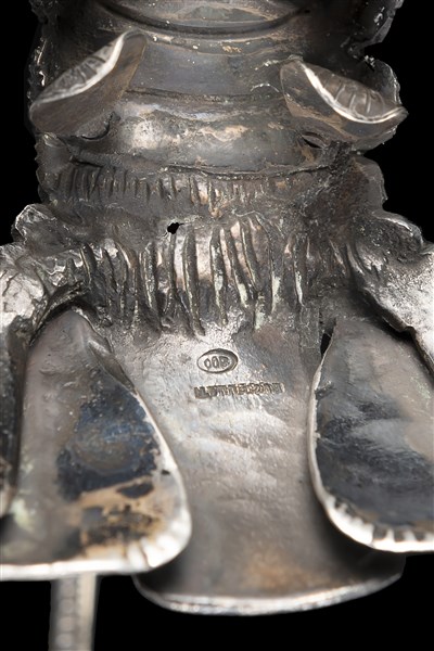 A silver sculpture representing a lobster with coral eyes. Titled 800, Buccellati silversmith (cm 21) (g 650)