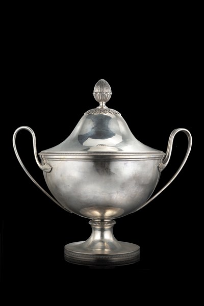 Grande zuppiera biansata in argento con bordi incisi a palmette, coperchio cimato da presa a guisa di grande pigna a tutto tondo. Firenze, secolo XIX. Argenteria Guadagni (h. cm 41) (g 3700 ca.)
