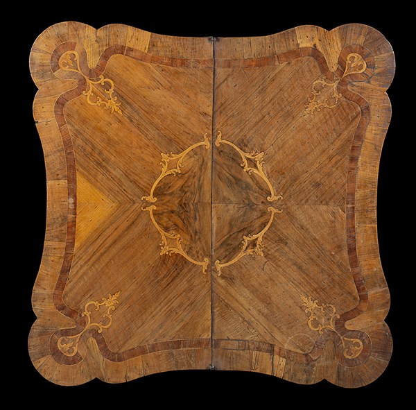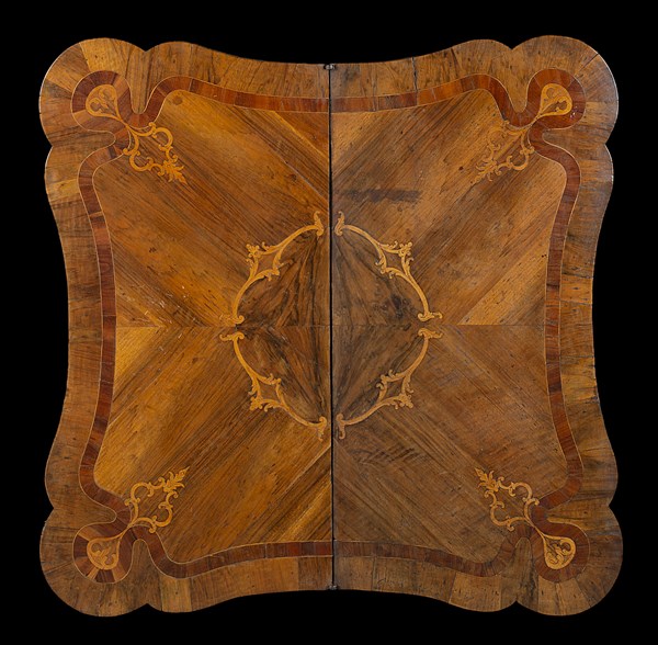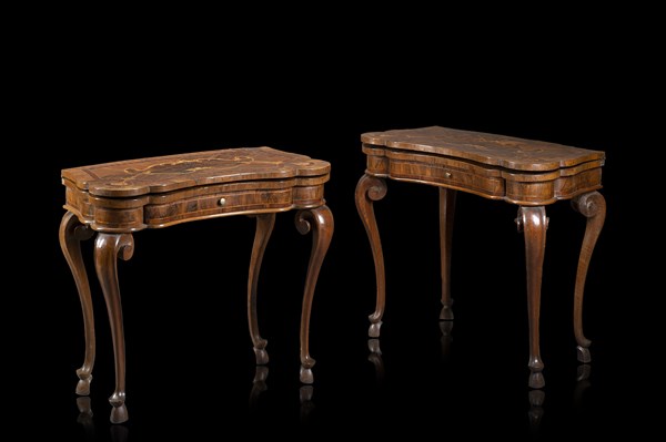 Coppia di tavoli da gioco di forma mossa lastronati in noce, filettati e intarsiati in legno chiaro e bois de rose, piano apribile centrato da cartella a volute fogliate entro riserva mossa, cassetto nella fascia. Gambe a ricciolo nell'attacco terminanti a zoccolo. Modena, secolo XVIII (chiusi cm 85,5x76,5x47) (difetti e restauri)