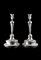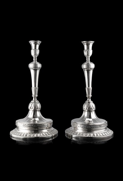 Coppia di candelieri in argento con fusto a colonna sfaccettata, base circolare
