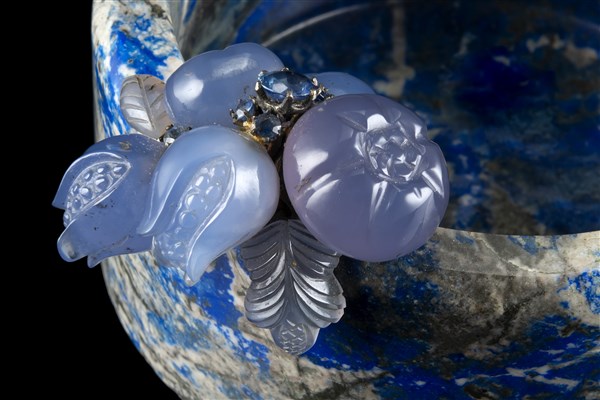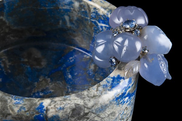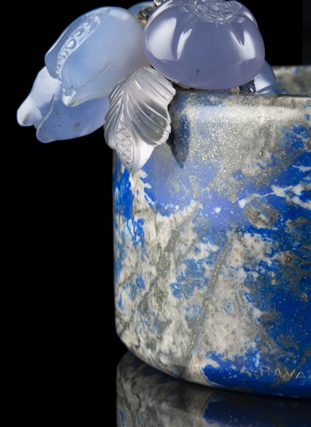 Ciotola in lapislazzulo, decoro a tutto tondo con melograni e foglie in calcedonio arricchiti da zaffiri. Firmata nel bordo (d. cm 8,5; h. cm 5)