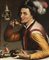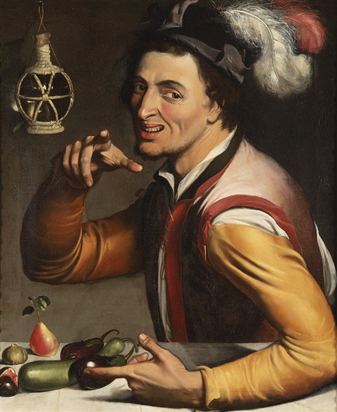 Portrait of a man in a feathered cap and composition of fruit and vegetables