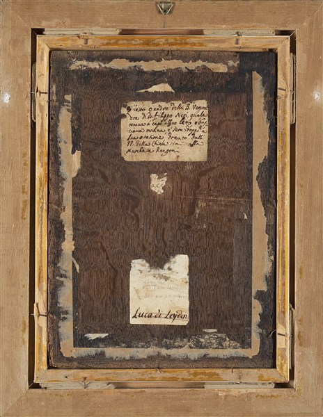 Al verso etichetta con iscrizione "Questo quadro della B. Vergine / era di S. Filippo Neri, quale / teneva a capo al Suo letto, e ba / ciava mattina e sera doppo a / Sua oratione, donato dalli / P.P. della Chiesa ... alla / Marchesa Rangoni" e altra etichetta con iscrizione "Luca di Leyden"